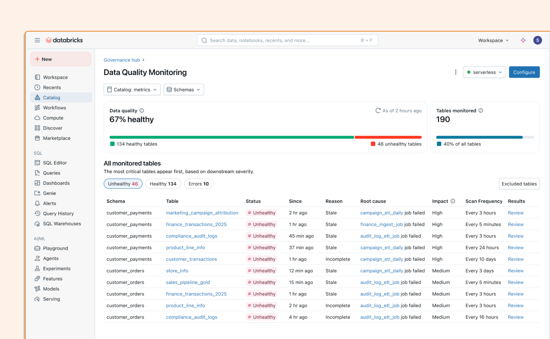 Prioritize issues based on business impact. Unity Catalog lineage and tags help teams focus on what matters most.