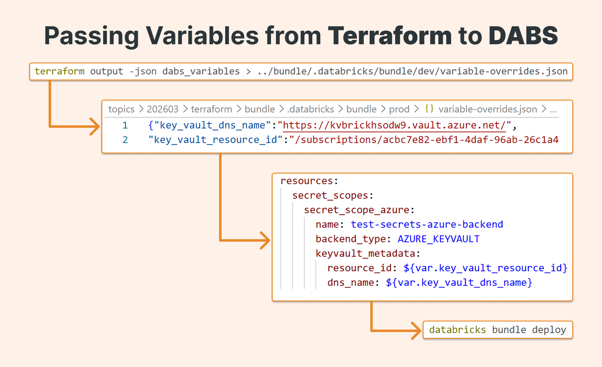 Here's a common composite: a data engineering team maintains two environments, dev and prod. Terraform manages the Azure infrastructure for both. Bundles manage the Databricks layer. The Key Vault resource IDs are different across environments, so someone maintains a mental map of which ID goes where, updates the bundle config manually before each deploy, and occasionally forgets.