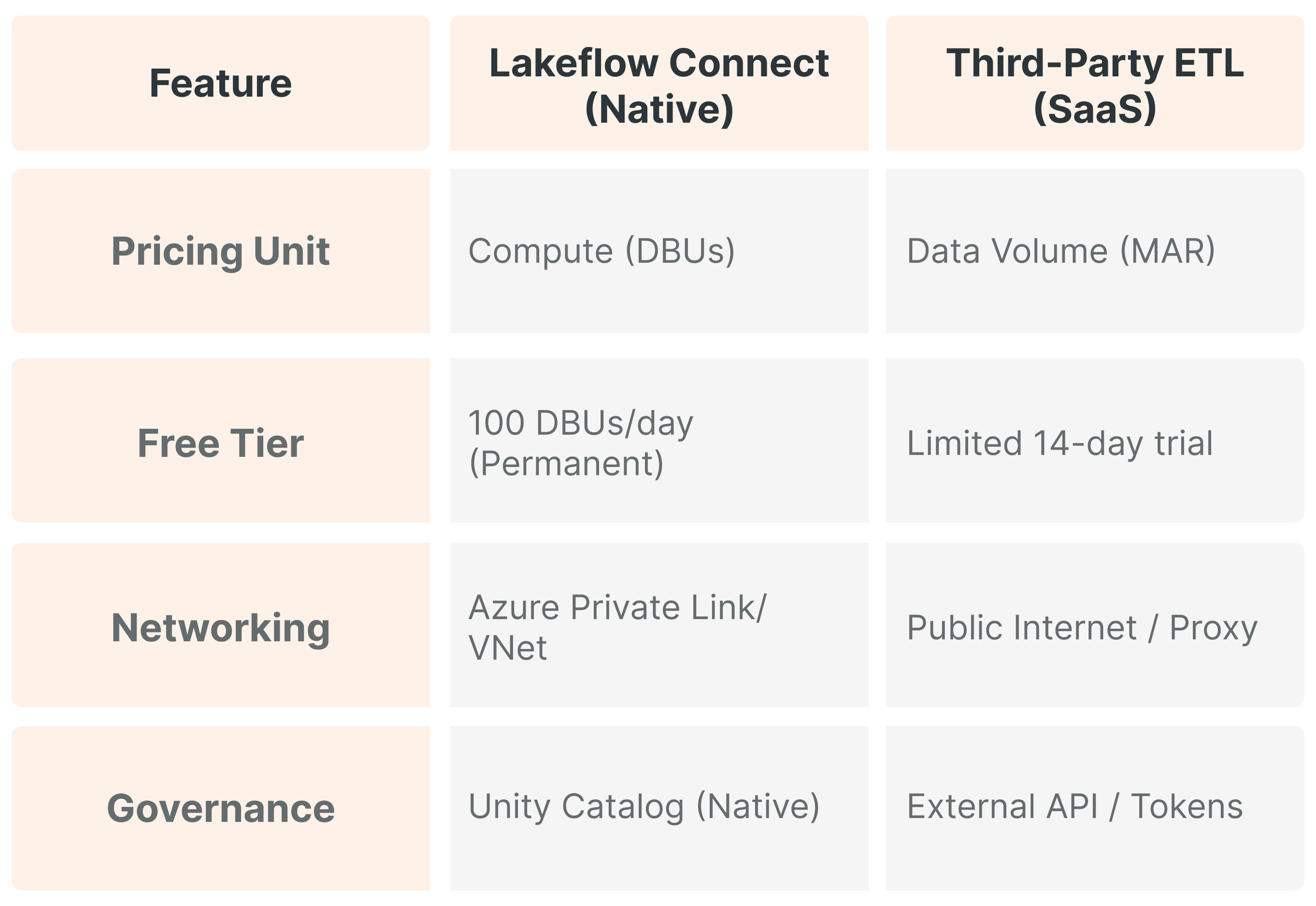 Compared with third-party services (we won’t mention specific software manufacturers), which typically charge based on Monthly Active Rows (MAR), Lakeflow Connect's DBU-based model is more predictable. MAR-based pricing can lead to "bill shock" during massive updates or full refreshes. Lakeflow Connect's cost is tied to the efficiency of the serverless compute rather than arbitrary row counts.