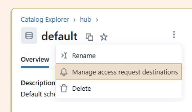 Once email notifications are enabled, the metastore admin or object owner can activate access requests by selecting "Manage access request destinations" in the options menu.