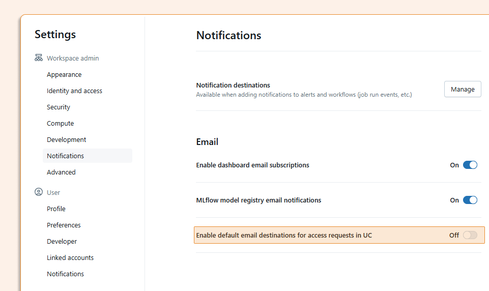 First, configure the default email destination in your workspace. This must be done by the metastore admin: