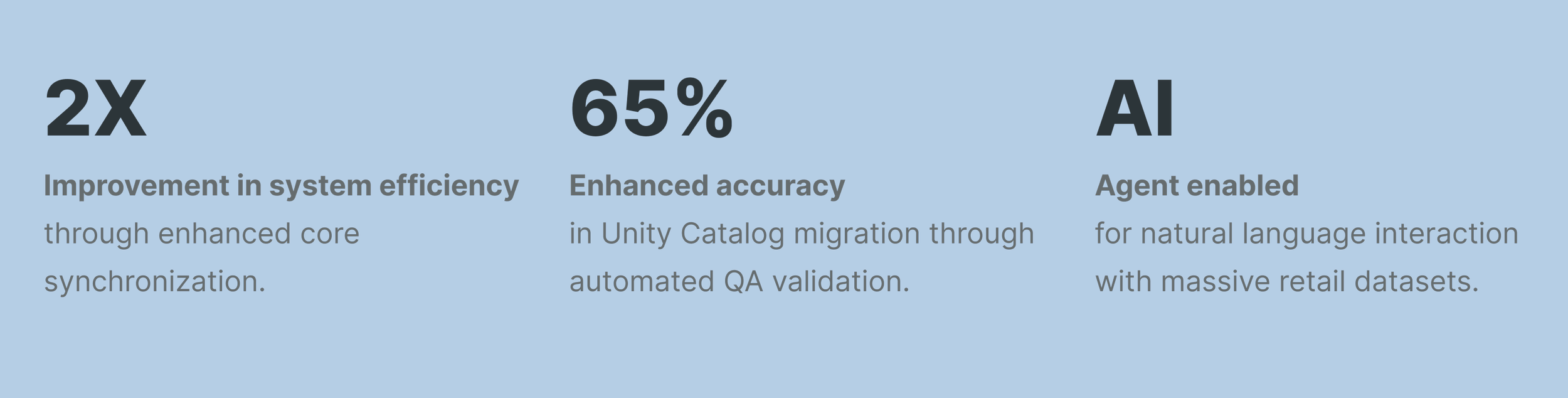Through improved core synchronization, d&n experienced a 2x reduction in processing time, going from 2 hours to just 10 minutes for their data workflows, leading to faster insights delivery. With the migration to Unity Catalog and the introduction of AI/BI Genie, business users gained direct access to data through natural language queries, eliminating technical and process barriers that translated into fulfilling requests from the IT and business teams in hours or even days.